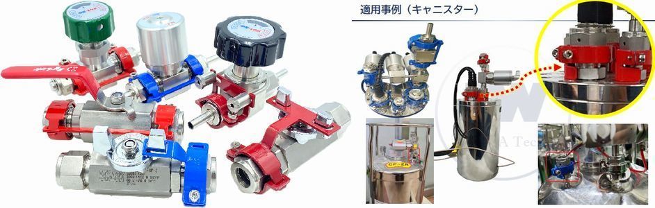 ・LOK継手、VCR継手、UJR継手の振動による外部リークを防ぐことが出来ます。。 ・継手、バルブ類、レギュレーター用のデバイスがございます。